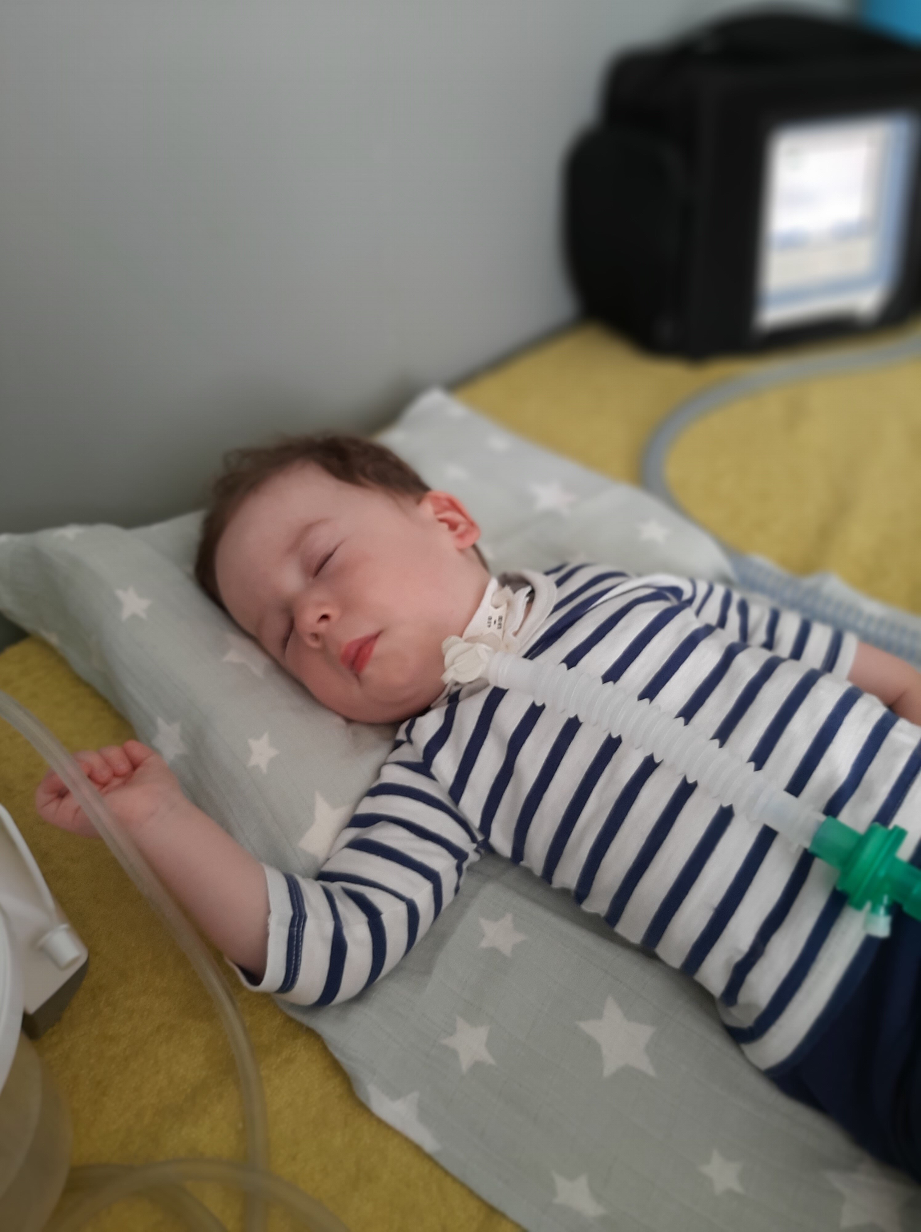 Niestety w wieku 5 miesięcy Kubuś zachorował na zapalenie płuc. Jego stan bardzo się pogorszył, wylądował na OIOM-ie. Dosłownie walczył wtedy o życie. W jego przypadku każda infekcja oddechowa może skończyć się tragicznie. Po 3 dniach od powrotu do domu Kubuś ponownie trafił do szpitala z zapaleniem płuc… Jego stan był tak ciężki, że znów trafił na OIOM, znów został zaintubowany. Pobyt na intensywnej terapii był strasznym przeżyciem. Widok własnego dziecka, tak malutkiego, bezbronnego, podłączonego do niezliczonej ilości rurek i aparatur, jest nie do opisania... Nie mogliśmy go przytulić, nie wiedzieliśmy, czy on nas w ogóle poznaje.